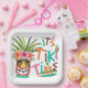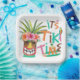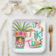 Die Teller des tropischen Tiki-Themenquadrats sind mit einem handgemalten Tiki-Totem, Ananas, Surfbrett und Papagei mit der Typografie "It's Tiki Time" versehen. Ideal für einen Hochzeitsempfang, eine Dusche für Paare, ein Glas, einen Geburtstag, ein Jubiläum und jede Inselfeier. Kunst von KL Stock