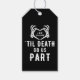 Hochzeitsgeschenk-Tags mit dem Zitat "Bis zum Tod machen wir Teil" und Skeletthand bilden ein Herz. Black Party liefert ein bearbeitbares Datum und die Initialen von Braut und Bräutigam. Besuchen Sie unsere Kollektion, um mehr koordinierende Elemente zu sehen, die dieses Design für Ihre besondere Veranstaltung passen.