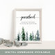 Dieses rustikale, waldlandschaftliche Chic-Schild, das auf unsere Hochzeitskollektion von Timber Grove abgestimmt ist, lädt Hochzeitsgäste ein, Ihr Gästebuch zu unterschreiben. Personalisieren Sie mit zwei Zeilen Text in Kalligraphie-Skript und traditionelle Serifenschrift (gezeigt mit "Gästebuch; bitte verlass Ihre Wünsche für den neuen Mr. und Mrs. [Name]"), mit einem unteren Rand von Aquarell immergrünen Bäumen in Jäger und Wald grün.