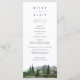 Mit diesem zweiseitigen Hochzeitsprogramm aus der Timberline-Kollektion von Redwood & Vine Design Co feiern Sie stilvoll Ihre Zeremonie. Mit ruhigen grünen Gebirgen und Kiefernwald-Akzenten bietet dieses elegante Layout ein sauberes und modernes Format für Ihre Zeremonie-Timeline und für Ihre Hochzeitsfeierlichkeiten. Ideal für rustikale, minimalistische Hochzeiten, Winterfeiern oder elegante Outdoor-Veranstaltungen inmitten der Natur. Passen Sie den Text an, um Ihre Feier zu Anzug.