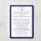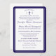 Design features the traditional format for a Catholic wedding invitation displayed in a navy-blue font against a white background. Top displays the monogram of bride and groom on either side of a cross. A small heading is featured above as an arch. Design is framed by an elegant navy and white border.