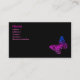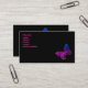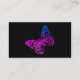 Ein winziger, bunt gefärbter Schmetterling an den Visitenkarten. Die Schmetterlingskonstruktion in der Farbe Ombre oder Farbverlauf. Lila und blauer Schmetterling auf schwarz.