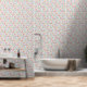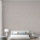 Tiny floral pattern wallpaper. Green stems and leaves with pink and orange flowers on an off-white background.