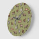 Diese Wanduhr beherbergt eine Herde winziger Ziegen in allen Farben auf einem gedämpften grünen Hintergrund.