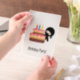 Niedlicher Cartoon Ninja ganz in Schwarz gekleidet ist pieking von hinter einer großen geschichteten Geburtstagstorte mit drei bunten Kerzen. Anpassbarer Text.