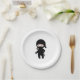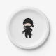 Niedlicher Cartoon Ninja in schwarz gekleidet hält einen Wurfstern. Traditionelles japanisches Schwert Katana kann man an seiner Schulter sehen.