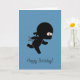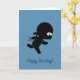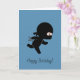 Niedliche kleine Ninja in schwarz gekleidet läuft, während sie einen Wurfstern hält. Anpassbarer Text.