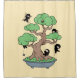 Einfache Abbildung eines japanischen Topfbonsai-Baumes in einem flachen Tablett. Eine Gruppe winziger Ninjas machte diesen Baum zu ihrer Basis. Mehrere Ninjas verstecken sich hinter dem Blätterdach. Eine ist von einem Seil an einen Ast gebunden, eine andere bewegt sich über dem Baum, der an einen Drachen befestigt ist.