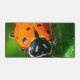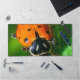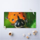 A bright red ladybug rests delicately on the surface of a vibrant green leaf, its tiny legs gripping the edge. The close-up perspective reveals the intricate patterns on its shell, highlighting nature’s small but remarkable details.