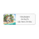Aufkleber für die personalisierte Holiday-Rücksendeadresse. Niedliches kleines festliches kleines, festliches Haus am Strand mit hübschen Weihnachtsdekorationen wie Kränze, Garland und Weihnachtsbeleuchtung auf Palmen.