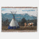 Ein Bild eines Indianers und seines Pferdes in der Nähe eines Tipis. Schnee hat sich auf den höheren Hängen der Berge im Hintergrund niedergelassen. Fügen Sie Ihren eigenen Text hinzu.