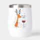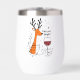 A funny and cheerful Christmas holiday design showcases a reindeer wrapped in festive lights, holding a glass of red wine, surrounded by colorful stars. The handwritten text says, "Tipsy and Bright." This delightful design is available on a variety of products, making it a perfect gift for wine lovers.