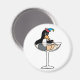 Ein niedlicher und zaghafter Pinguin, der beim Cocktail-Glas, in dem er sitzt, wegschleicht.