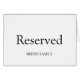 Dieses ist eine reservierte Tabellenzeichenkarte. Es ist elegante Skriptkalligraphie für extravagantes Hochzeits-Party, Chic-Brautparty, Verlobung oder Jahrestag. Es ist noble Platzierungs-Mitteilungskarten mit Namen der Braut und Bräutigamfamilie, VIP-Gäste, Brautjungfern, Trauzeugen, Trauzeuge, Trauzeugin etc. Text und Entwurf können für jede mögliche Einladungskarte besonders angefertigt werden.