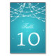 Elegantes Hochzeitsdesign "Tischnummer" mit Sparkling String Türkis und benutzerdefinierter Tischnummer Text.