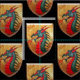La peinture du picotin de Linda Baysinger d'un vert, dragon médiéval et européen, sur le bouclier de couleur d'or, avec l'arrière - plan noir. Picotin de Linda Baysinger de © d'image tous droits réservés