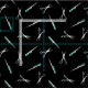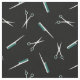 Toile noire avec un motif moderne de ciseaux et peignes en blanc et turquoise.