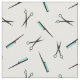 Blanc de tissu avec un motif moderne des ciseaux et des peignes en noir et turquoise.