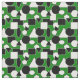 Ce tissu a une conception Bauhaus de triangles, cercles, rectangles et pentagons en noir et blanc sur un champ de vert.