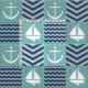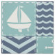 Un motif de carrés turquoise orageux, décoré d'un voilier et d'une ancre blancs, et de carrés bleu marine, agrémentés de chevrons et de vagues bleu pâle, est orné de coutures blanches pour créer une atmosphère nautique classique.