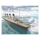 Berühmtes Titanic-Schiff, das bei bewölktem Tag zwischen Eisbergen auf dem Wasser schwebt