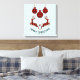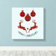 Impression de toile qui dit "Joyeux Noël" en texte courbe. Conçu avec une illustration de 2 cerfs de Noël sautant. Les cerfs sont faits de sériole rouge et noire, avec un peu de coeur entre eux. Les décorations de Noël en plaid rouge et noir sont accrochées au sommet. Arrière - plan bleu clair.