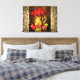 Fruits vintages antiques et toile fleurie. Toile avec une belle image vintage antique d'un vase jaune de fleurs rouges, entourée de raisins et grenades verts et rouges. L'arrière - plan est un motif marron et grungy damassé.