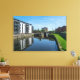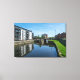 Une photographie lumineuse et haute résolution capturant l'aménagement moderne du front de mer le long de la navigation Calder & Hebble à Wakefield. L'image met en valeur un grand complexe d'appartements revêtu de blanc et de bois avec des balcons en verre, parfaitement reflété dans les eaux calmes du canal. Au milieu, les structures en pierre de l'écluse de Fall Ings et une passerelle piétonne sont visibles, sur fond de logements en briques rouges et de ciel clair. Cette perspective met en évidence la réussite de la rénovation urbaine des docks historiques de Wakefield.