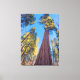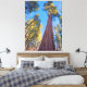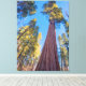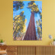 Un séquoia imposant domine le cadre, son tronc massif qui s'avance vers un ciel bleu clair. L'écorce de l'arbre est d'un brun rougeâtre riche, avec des sillons et des textures profonds. Le point de vue du spectateur se trouve en contrebas, regardant l'arbre, soulignant sa taille immense. D'autres séquoias entourent l'arbre central, leur feuillage vert créant un couvert dense au-dessus.