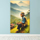 L'oeuvre représente un fermier indonésien âgé, assis dans une réflexion tranquille au-dessus des collines en terrasses brumeuses, incarnant le lien intemporel entre l'humanité et la nature.