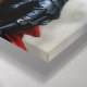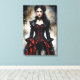 Une jeune femme gothique époustouflante avec des cascades de cheveux noirs. Elle porte une robe noire et rouge Gothic Punk Rave Long Coats Femmes Steampunk Victorian Retro Robe Brocade Veste.