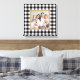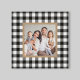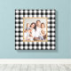 Cette ferme style plaid Christmas vacances mur toile d'art dispose d'un espace photo de famille carré personnalisé encadré par une bordure bronzée avec un chèque-buffle noir et blanc / arrière - plan à motifs plaid. Conseil photo : recadrez votre photo sur une forme carré avant de la télécharger.