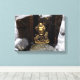 Une belle toile imprimée d'un Happy Bouddha doré protégé par un rocher tandis que l'océan s'écrase autour de lui.