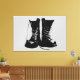 Des bottes noires sur un arrière - plan gris clair. Impression de style vintage personnalisé. Idée cadeau.