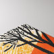 Cette oeuvre représente un paysage désertique avec de grands cactus noirs dressés contre un arrière - plan vibrant et abstrait de chauds lavages d'aquarelle orange et bleu cool. Les cactus sont illustrés dans un style linocut, avec des lignes audacieuses et foncées et une texture détaillée, contrastant avec les couleurs douces et fluides du ciel. Les motifs circulaires, comme des ondulations, de l'arrière - plan suggèrent un effet de soleil ou d'onde de chaleur, ajoutant un intense sentiment de chaleur et de sécheresse à la scène. Des arbres fins et sans feuilles et des détails de terrain désertique fissurés complètent le paysage aride et clairsemé.