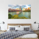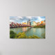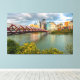 L'image montre le pont de la Paix à Calgary, Alberta, Canada, avec la ligne d'horizon de la ville en arrière - plan. Le pont, avec son design distinctif en rouge et en verre, s'étend sur une rivière reflétant le ciel. Des fleurs jaunes fleurissent au premier plan, ajoutant une touche de couleur. Le paysage urbain présente des bâtiments modernes aux façades en verre, reflétant la lumière du soleil.