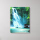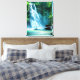 Toile illustrée d'une cascade en bleu pâle avec pulvérisation blanche, entourée de rochers et de feuilles verts