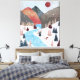Un magnifique paysage aux textures uniques montrant un paysage de rivière et de montagne avec un renard en chasse à mi-sauts dans la neige dans les tons rouge, vert, bleu et beige.