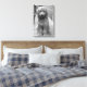 Un adorable chiot en peluche Goldendoodle assis sur un jardin béton marchent le long d'un mur en brique en noir et blanc.
