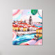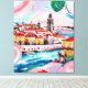 Un dessin animé en toile de Lisbonne, Portugal, qui présente ses toits rouges, ses tours historiques et son charme au bord de la rivière. Les coups de pinceau audacieux et colorés donnent vie à l'esprit vibrant et à la beauté culturelle de la ville dans une composition artistique.
