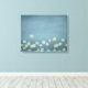 Dandelions Going To Seed est un design sur toile étirée. Les couleurs sont bleues et blanches, avec des graines de pissenlit survolant les fleurs...