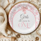 Celebrate your little girl's first birthday with this charming Coquette-inspired Paper Plates, perfect for the modern, stylish one-year-old! Featuring a delicate pink bow and the playful slogan "Girls Just Wanna Be ONE," this design captures the essence of youthful fun and elegance. Ideal for a chic, feminine birthday celebration, this design blends a sweet coquette style with soft, inviting colors. Customize the details to make it uniquely yours and create a memorable first birthday announcement that family and friends will adore.