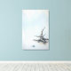 Un morceau de bois flotté s'appuie sur une surface lisse et réfléchissante, entourée d'une toile de fond minimaliste et éthérée. La scène tranquille dégage un sentiment de solitude et de calme.