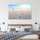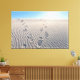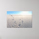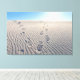 Une série d'empreintes de pieds mène à une dune de sable blanc en pente douce. Les empreintes sont claires et distinctes, ce qui suggère que quelqu'un a récemment traversé le sable. La dune est recouverte de vagues de sable doux et ondulant, créant une surface texturée. Le ciel est d'un bleu vif, le soleil brillant dans le coin supérieur droit de l'image.