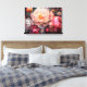 Un gros plan saisissant de pivoines et de roses en fleurs, présentant des pétales fluides dans les tons rose, pêche et blanc contre un arrière - plan sombre. Cette belle oeuvre florale apporte vie et élégance à toutes les chambres.