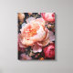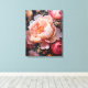 Un gros plan saisissant de pivoines et de roses en fleurs, présentant des pétales fluides dans les tons rose, pêche et blanc contre un arrière - plan sombre. Cette belle oeuvre florale apporte vie et élégance à toutes les chambres.