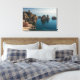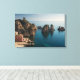 Impression paysage de toile des célèbres rochers I Faraglioni dans la mer Méditerranée et le bâtiment Tonnara rouge dans la ville de Scopello, près de la réserve naturelle Lo Zingaro sur la côte nord de l'île de Sicile, Italie.