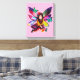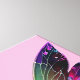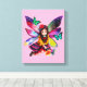 Une jeune fée aux ailes multicolores vibrantes s'agenouille gracieusement, entourée de papillons clignotants. Elle est ornée d'une tenue colorée avec des fleurs accentuant ses cheveux et tient une fleur délicate dans la main. Arrière - plan rose solide