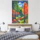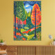 Un imprimé de linocut vibrant dans un style d'art populaire inspiré par Marc Chagall, représentant une scène de forêt lunatique. Des arbres fantastiques, des couleurs vives et des détails ludiques évoquent un sentiment de magie et d'émerveillement.