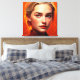 A girl with blue eyes on orange background, dark black and crimson, photoréalistic fantasies, personal iconographiy, detailed character design, shiny/glossy